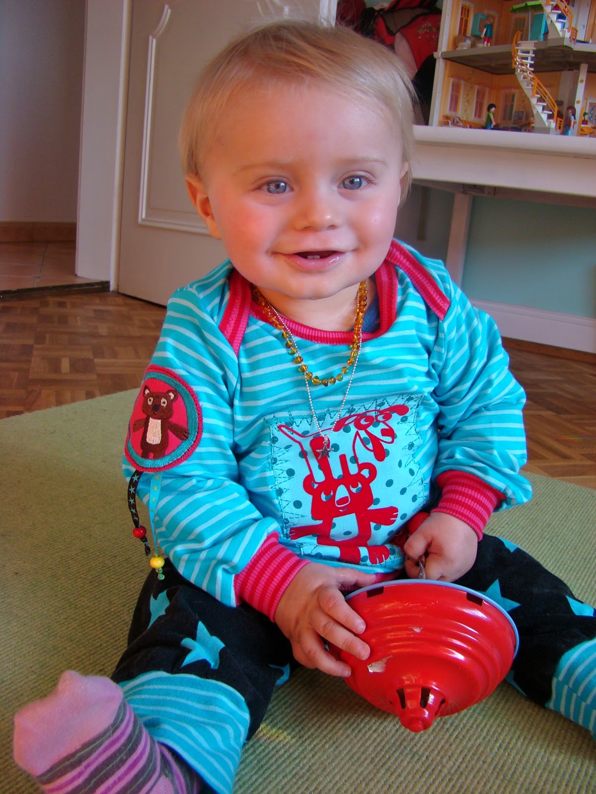 Today I sewed night for Bastian a sweater. It is a real Peppauf Shirt become. Front romp on it with the bear the sweet little dog on the head. Ausserm a stamped label and a mushroom patch (also used). On the back of the crocodile runs with his friend the bird. Under the Button embroidered on the sleeve dangle two band remains out with wooden beads. Bastian loves something. So that it can deal ever. He examined it again and again throughout the sweater whether there are more of the variety. * Grin * Today is no longer without a sweater and no pants sewn "toy".